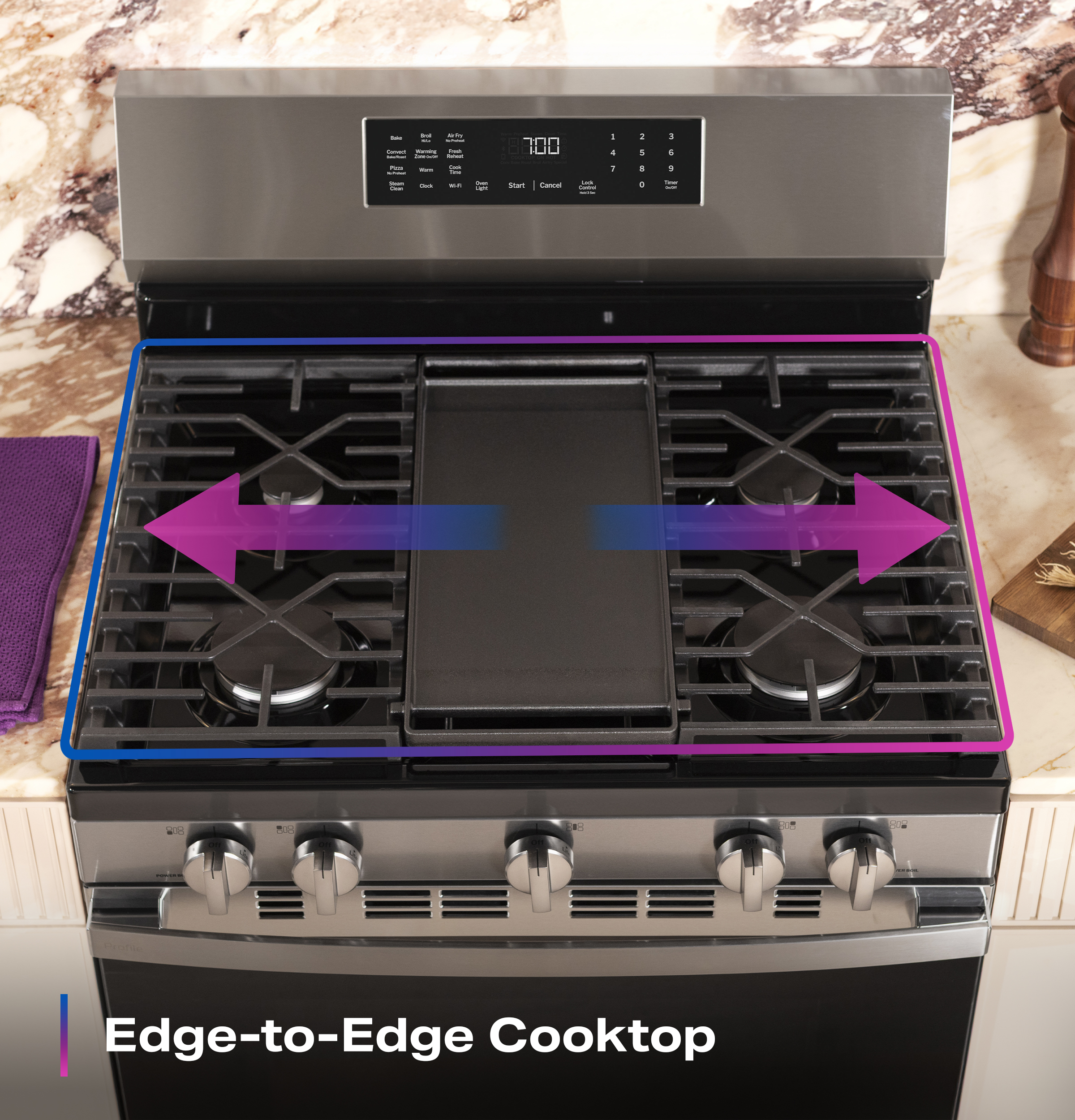 - Continuous, edge-to-edge cooktop gives you a large cooking space and can handle any cookware.