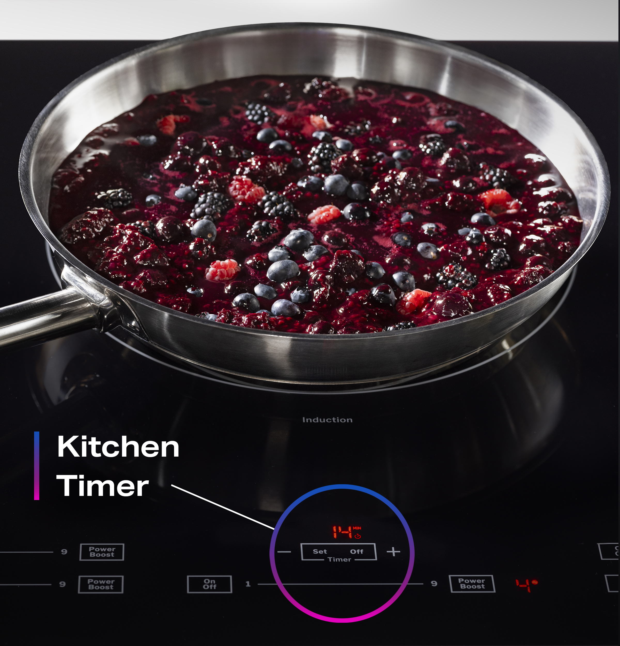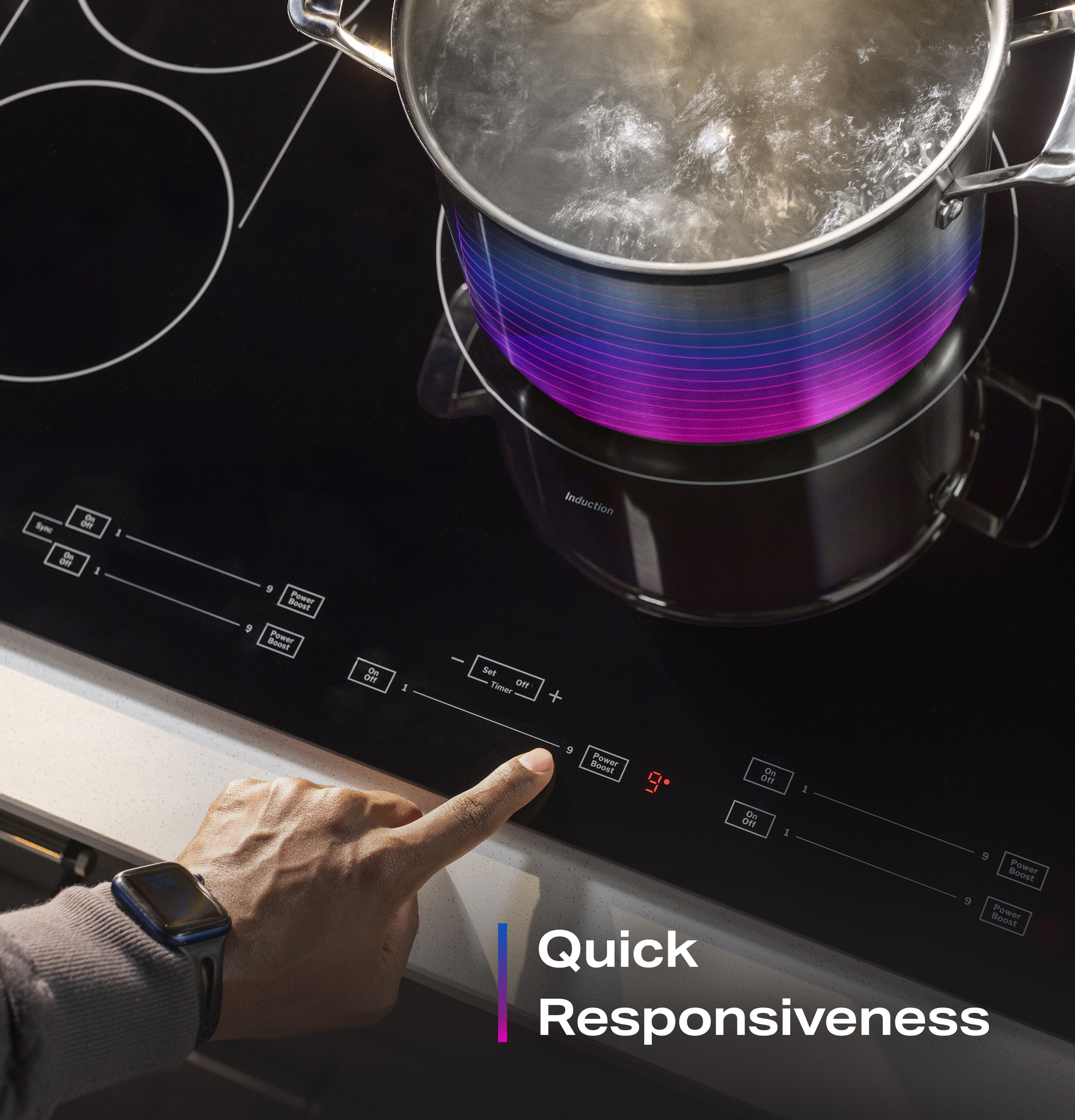 - Intensify one burner’s heat by redirecting power from others, so you can boil, sauté, reduce, brown, and char quickly.
