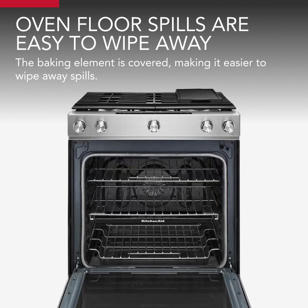 - This gas slide-in range provides a large cooking capacity that’s perfect for multiple dishes at once.